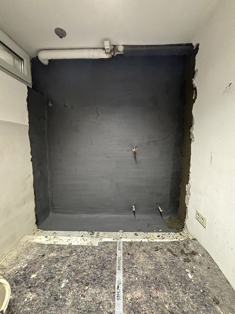 2. Anwendung der Abdichtung: Aufbringen einer mehrlagigen, rissüberbrückenden mineralischen Dichtschlämme auf Wände und Bodenplattenbereich (ca. 30 cm Höhe und Breite).