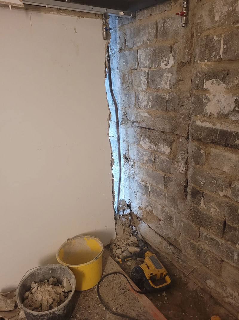 3. BKM-Vertikalsperre: Mittels Spezialpumpe wurde ein hochwertiges Injektionsmittel in das Mauerwerk injiziert. Dies unterbindet den kapillaren Feuchtetransport und schützt angrenzende Wandbereiche dauerhaft.