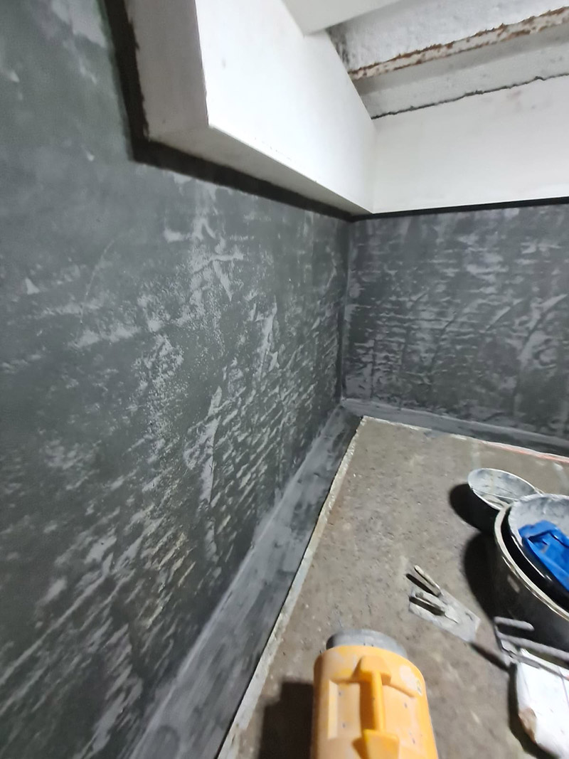 - Untergrundsanierung: Ausbesserung der Fehlstellen und Erstellung einer Nut im Boden-Wand-Anschlussbereich zur sicheren Verbindung der Abdichtungsebenen.